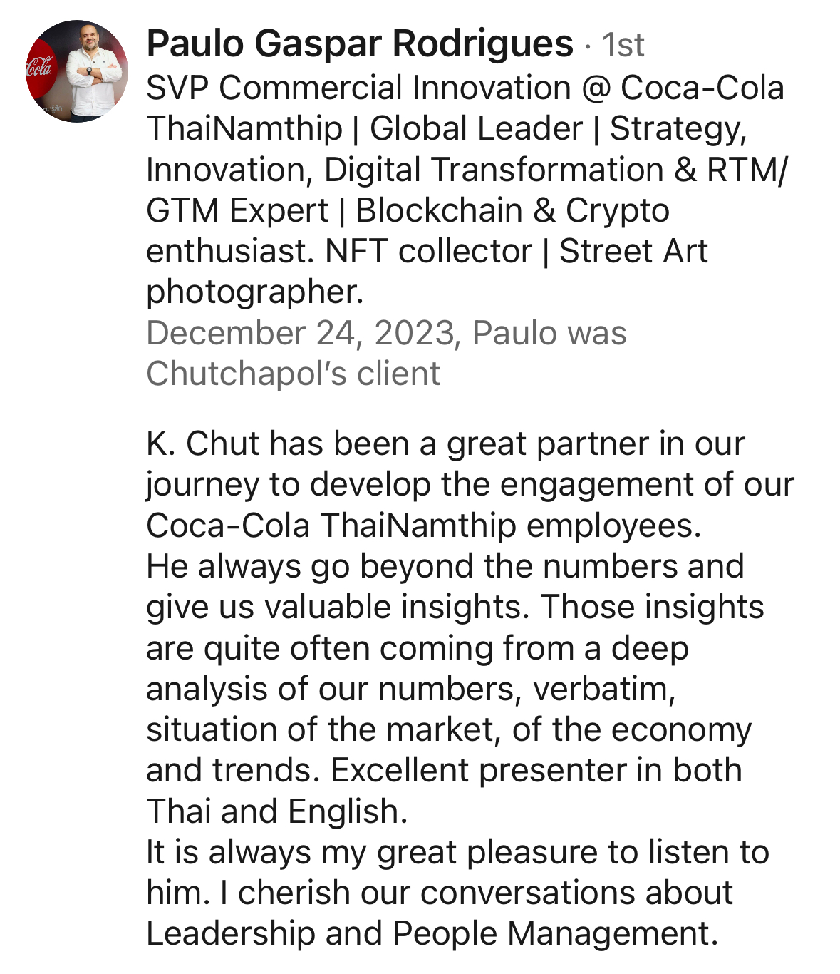 ปีนี้เห็นผลของการ add value ให้ลูกค้าที่เป็นผู้บริหารระดับสูงในองค์กรต่างๆ อย่างชัดเจน ลูกค้าประทับใจและเชื่อในความรู้ความเข้าใจในการแนะนำ และบริบทของเขา ทำให้บทบาทของ trusted advisor ชัดเจนมากขึ้น ซึ่งเป็นสิ่งที่ตั้งเป้าและวางแผนในการทำงานกับลูกค้าในช่วง 2 ปีที่ผ่านมา